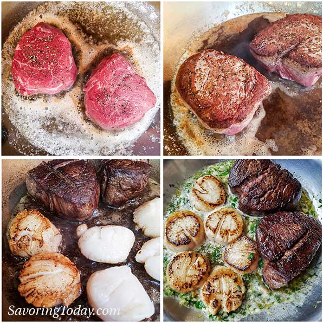 - Turn the steaks on end and rotate to brown the sides (this will take about 3 minutes), then turn over to brown the final side for 4 to 5 minutes. When turning the steak to brown the last side, add scallops to the skillet to brown at the same time, about 2 minutes on each side.